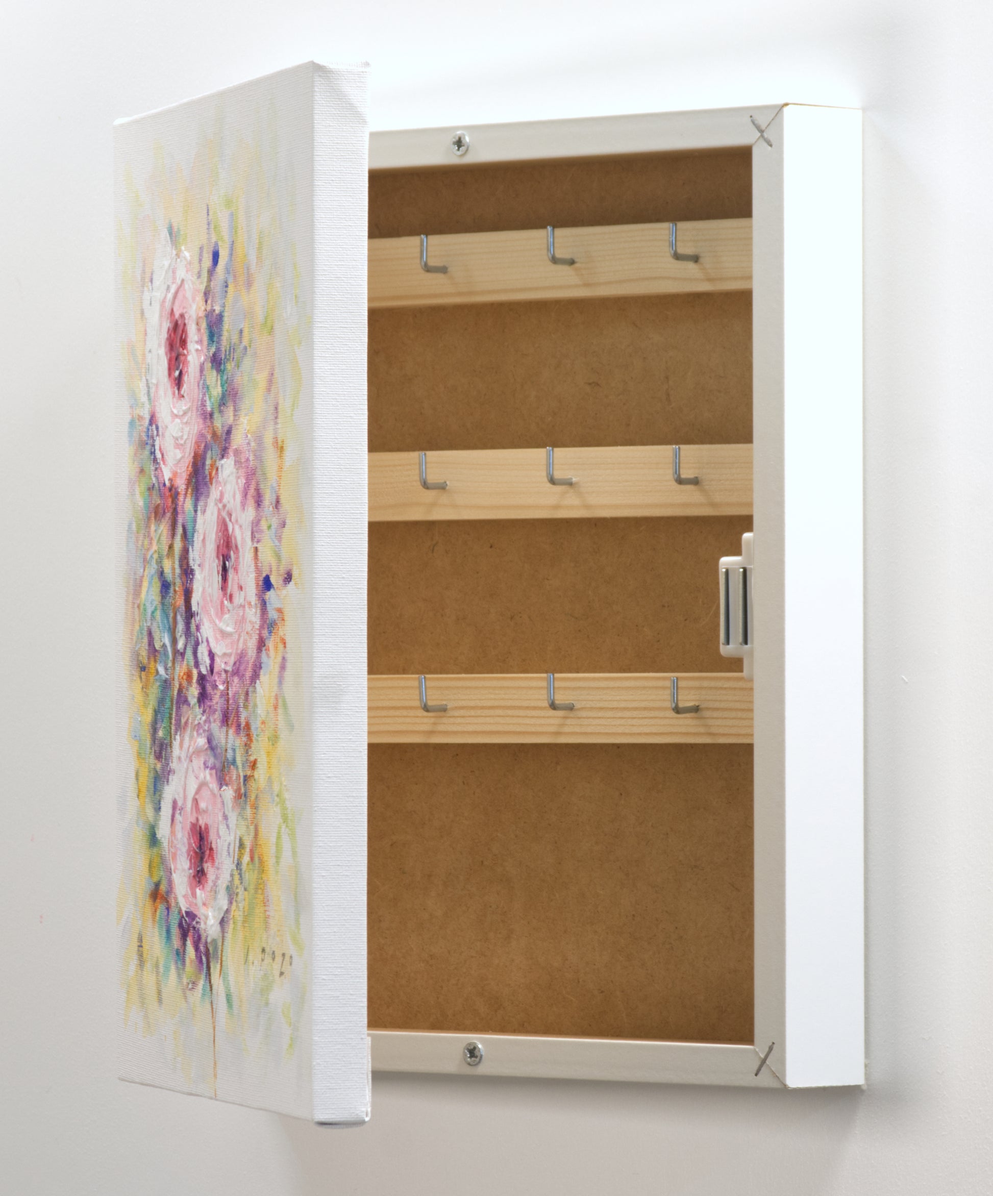 Armario para Llaves, Pintado a mano, con 12 ganchos, Flores rosas, con relieve, 100% original, Firmado, Incluye tacos y tornillos.