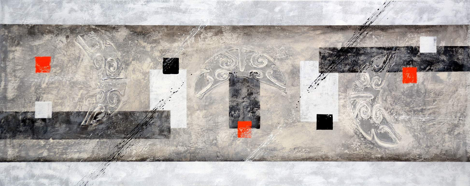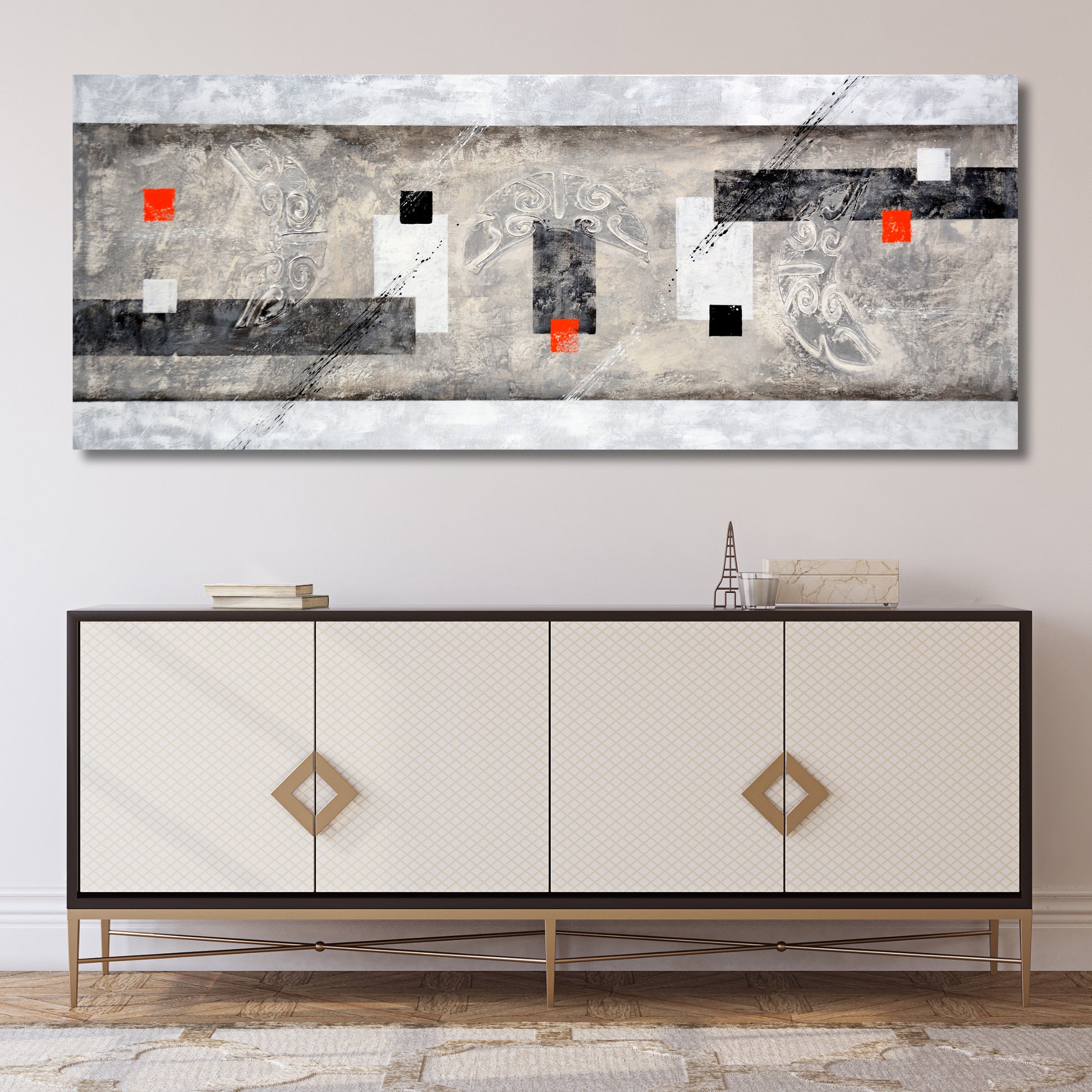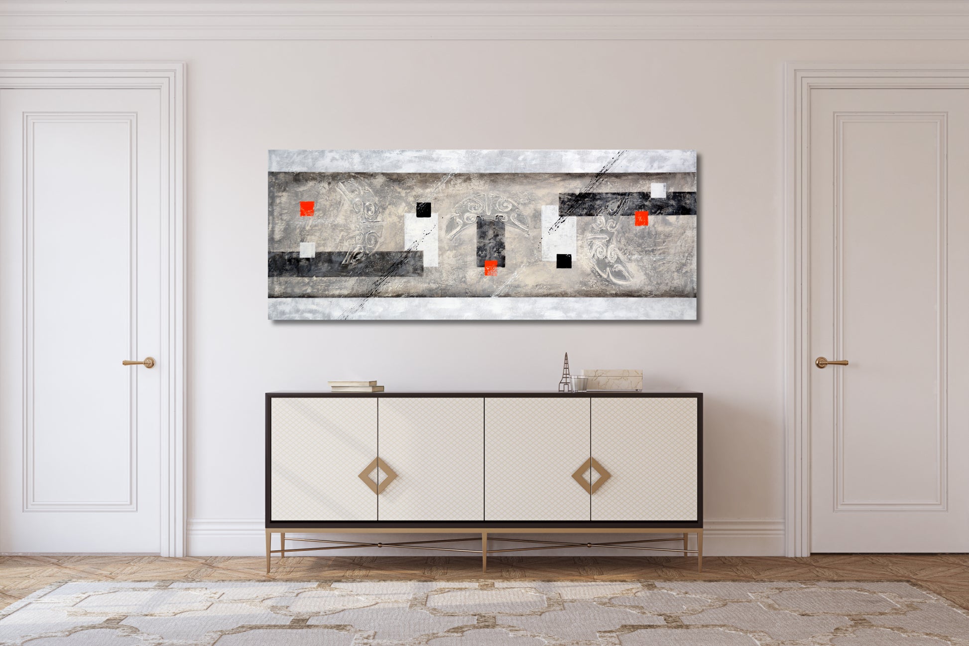 Este cuadro pintado a mano "Abstracto Lunas" de 150x60cm será el elemento perfecto para tu hogar. Con su diseño moderno y abstracto en colores plata, negro y rojo, este cuadro con relieve añadirá un toque de elegancia a cualquier espacio. Ideal para decoraciones modernas en salones o dormitorios. Firmado por el artista para garantizar su autenticidad.