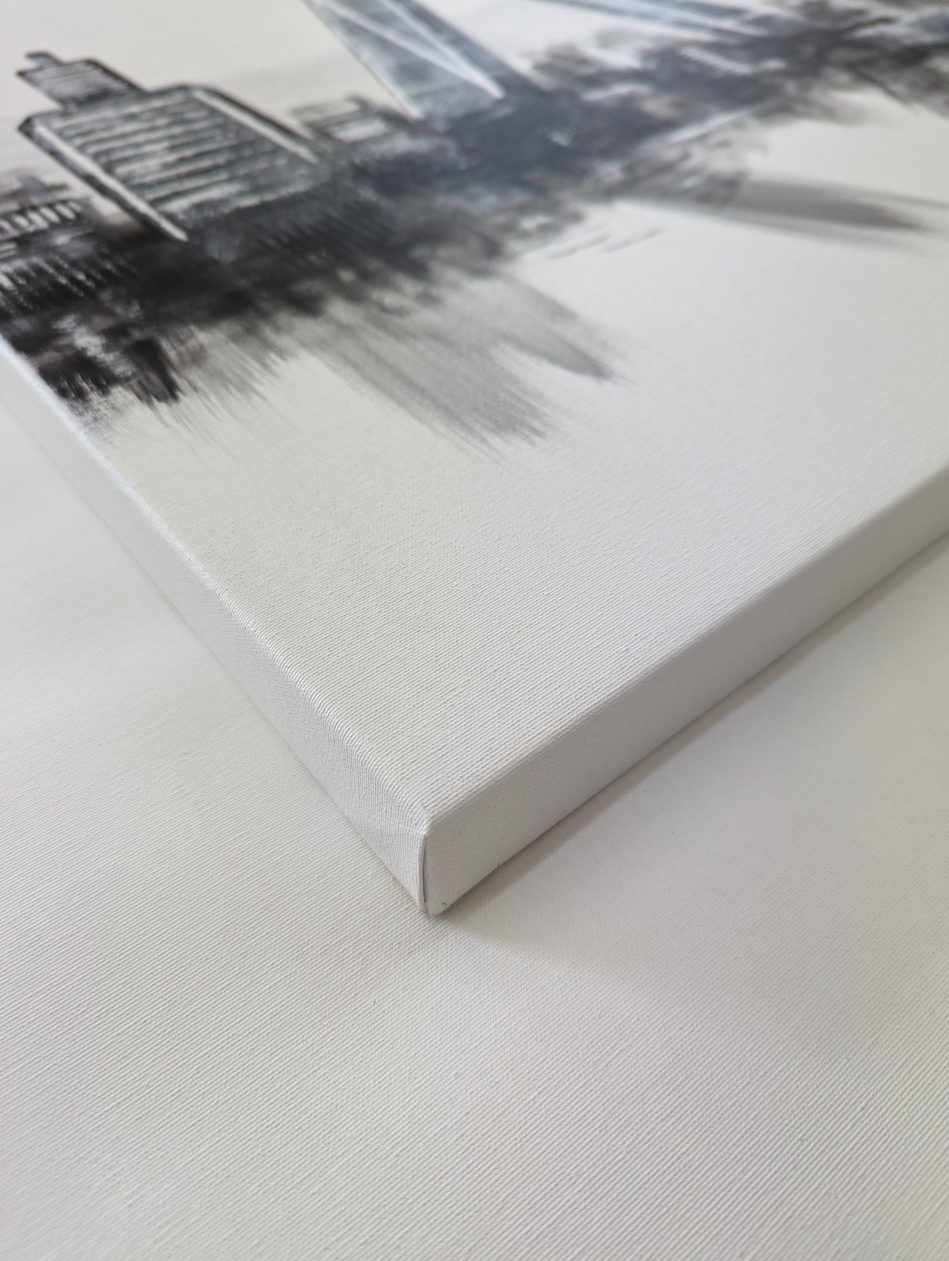 Cuadro pintado a mano sobre lienzo, que representa el perfil de Madrid con sus edificios más emblemáticos. Se cuelga sin marco, el lateral va pintado de color blanco.