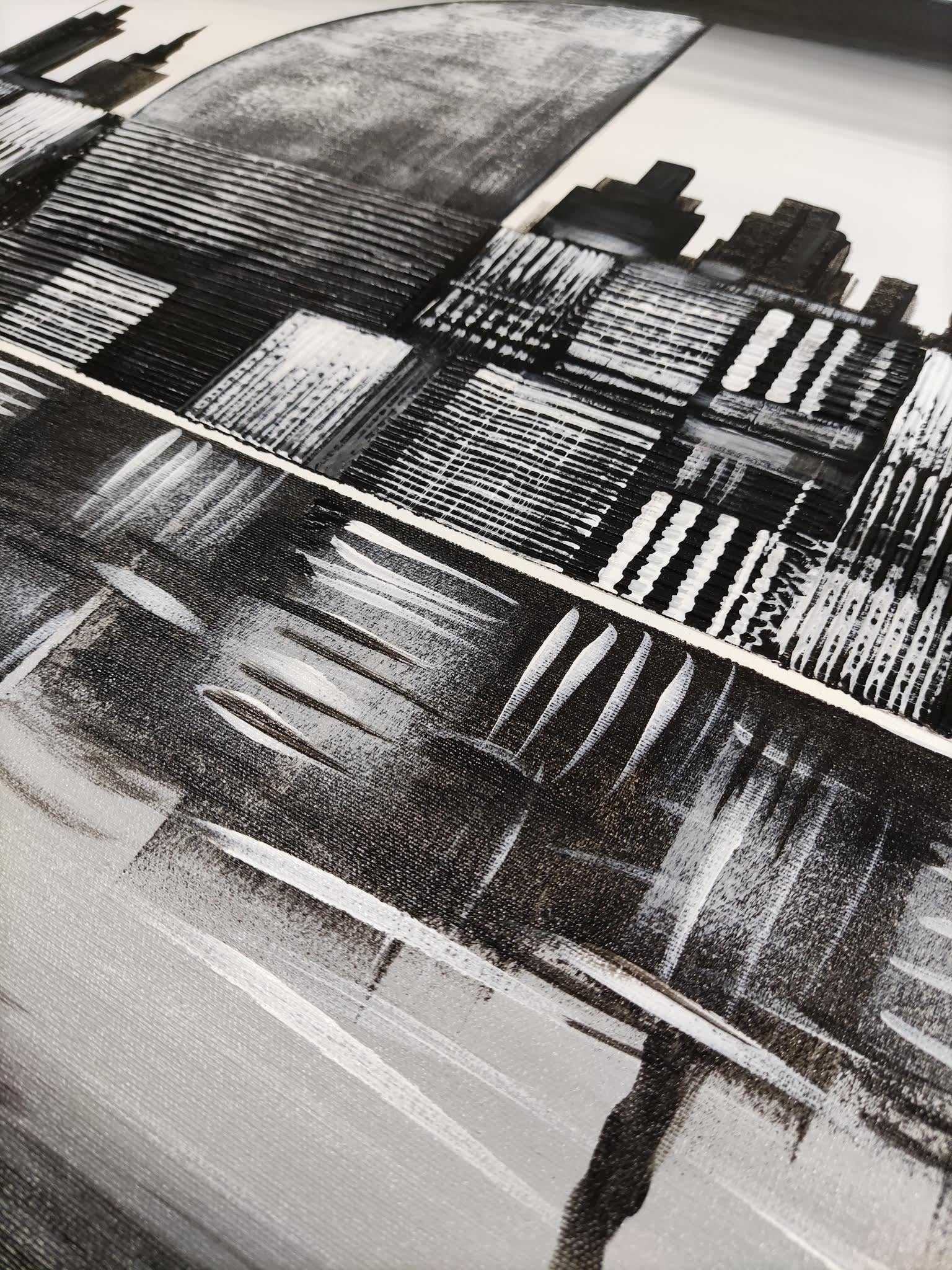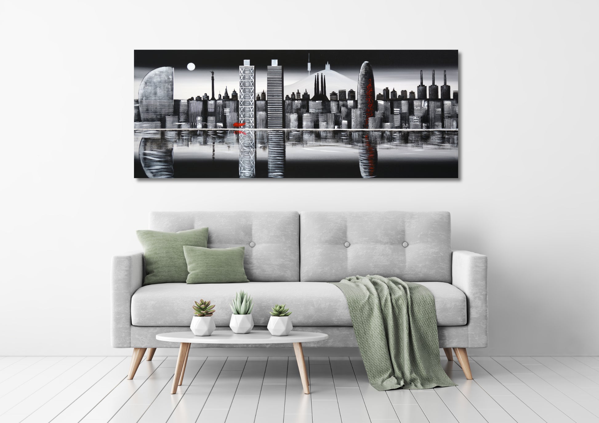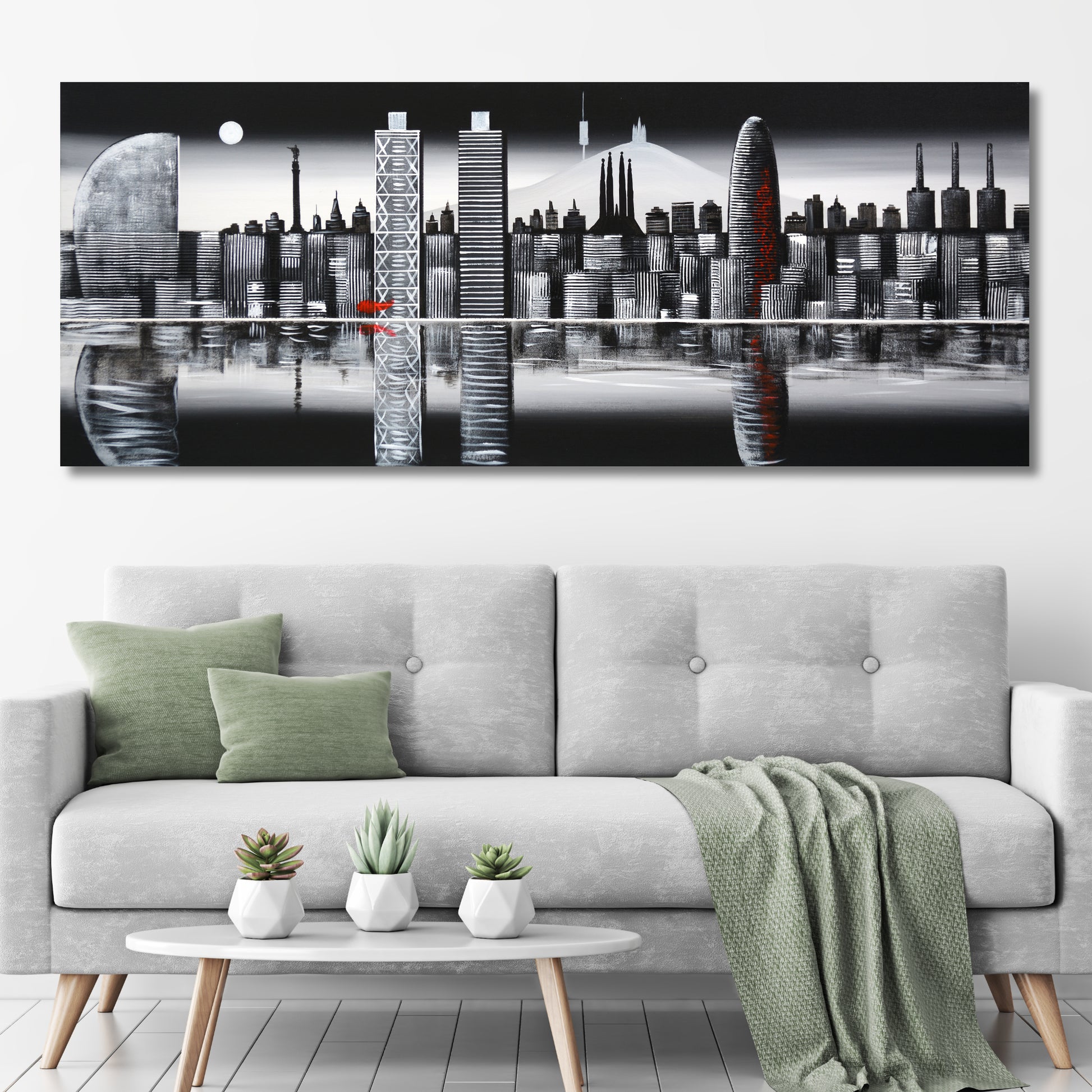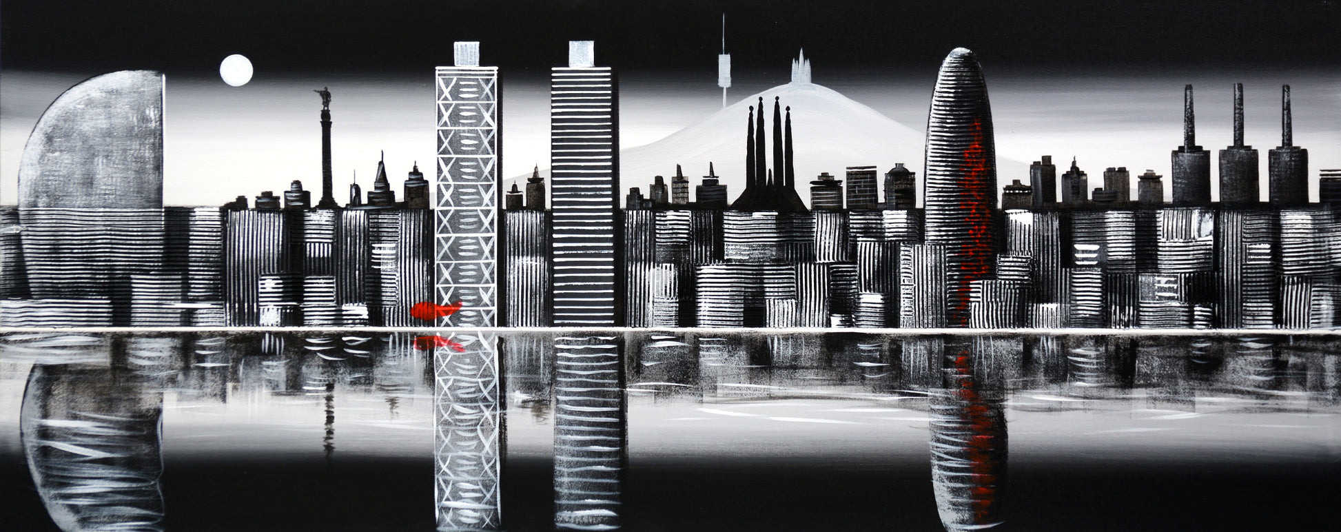 Cuadro pintado a mano sobre lienzo, que representa el perfil de Barcelona visto desde el mar, con sus edificios más simbólicos.