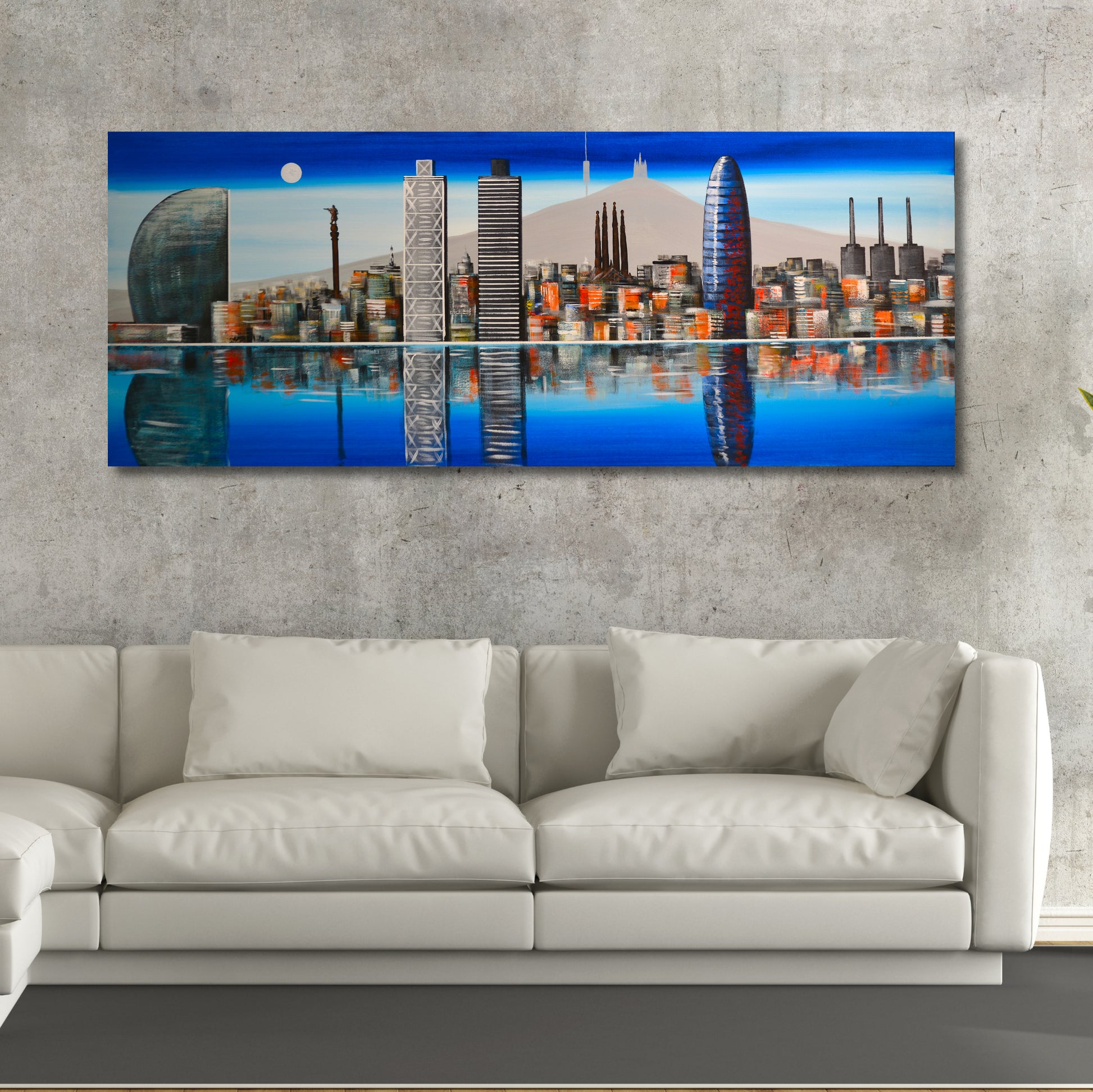 CUADRO PINTADO "SKYLINE DE BARCELONA" AZUL 150X60CM