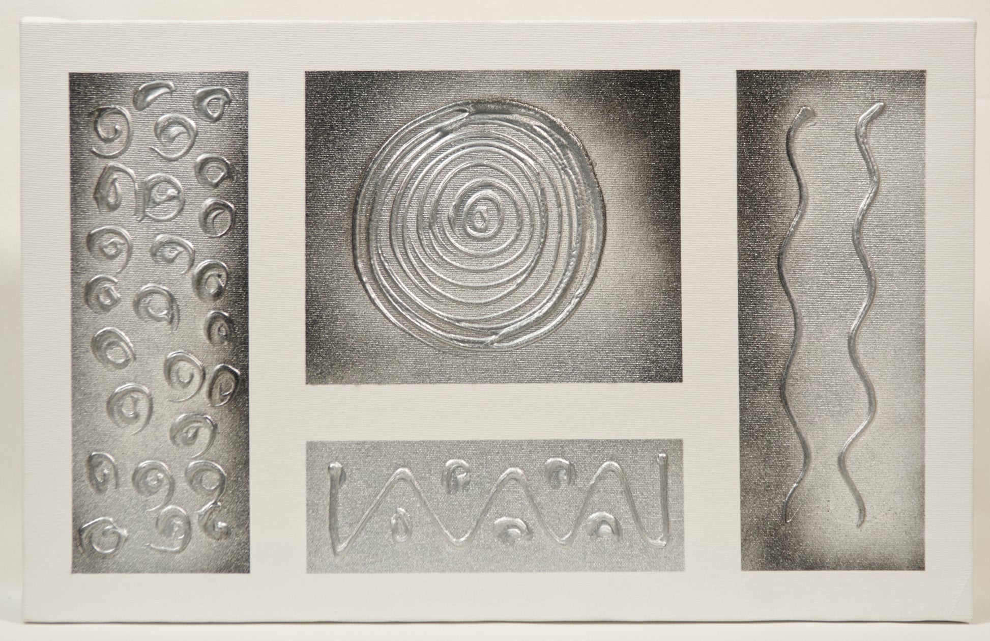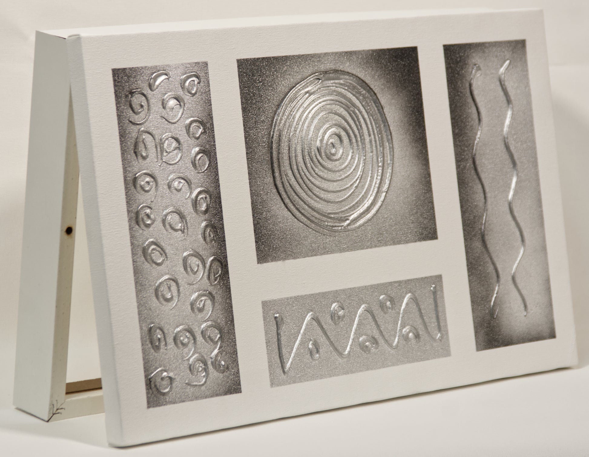 Tapa de Contador Pintada a Mano, 100% Original, Abstracta en Plata y Blanco, Incluye Tornillos y Tacos. Medidas: Interior 37x22x4cm Exterior 41x26x6cm