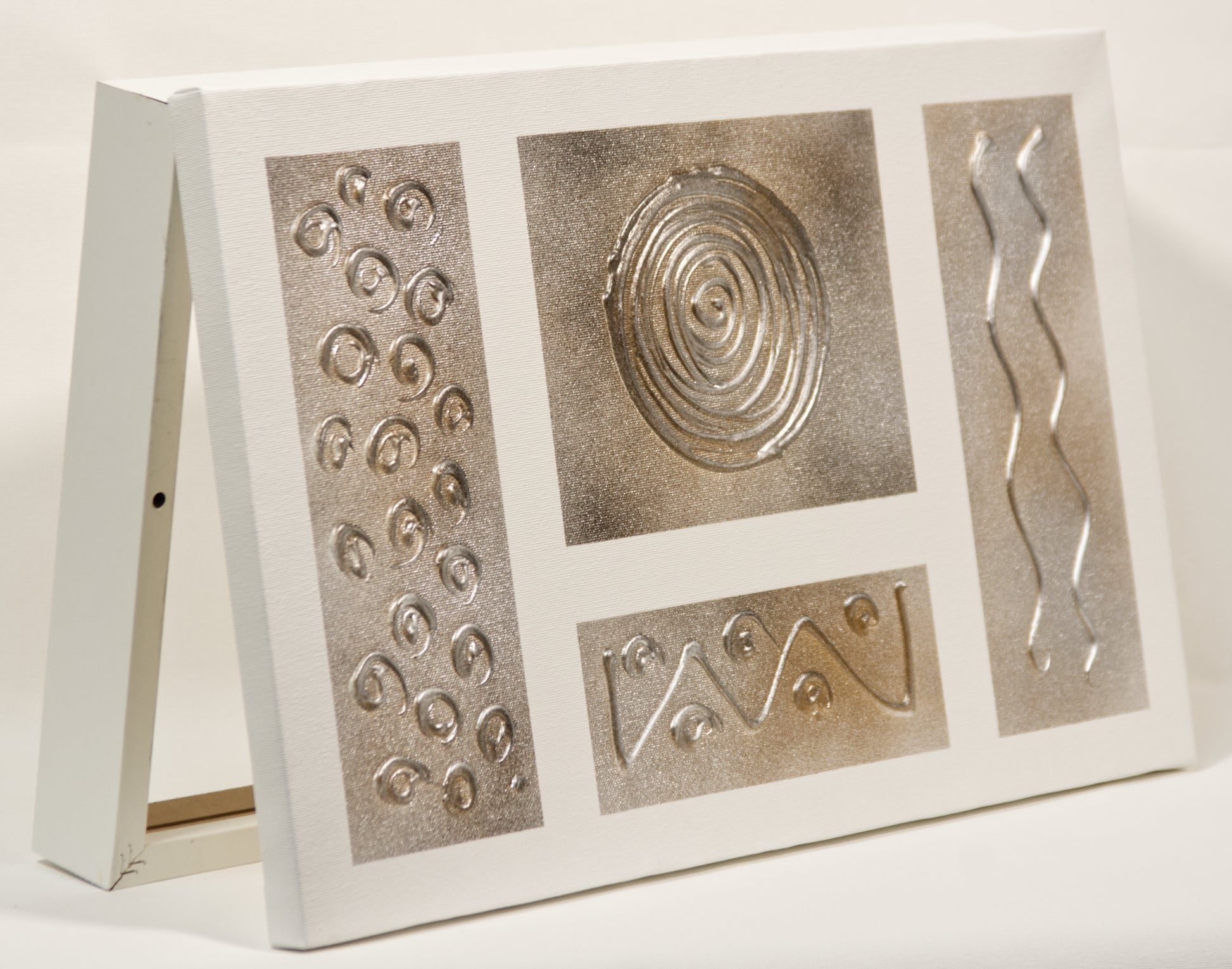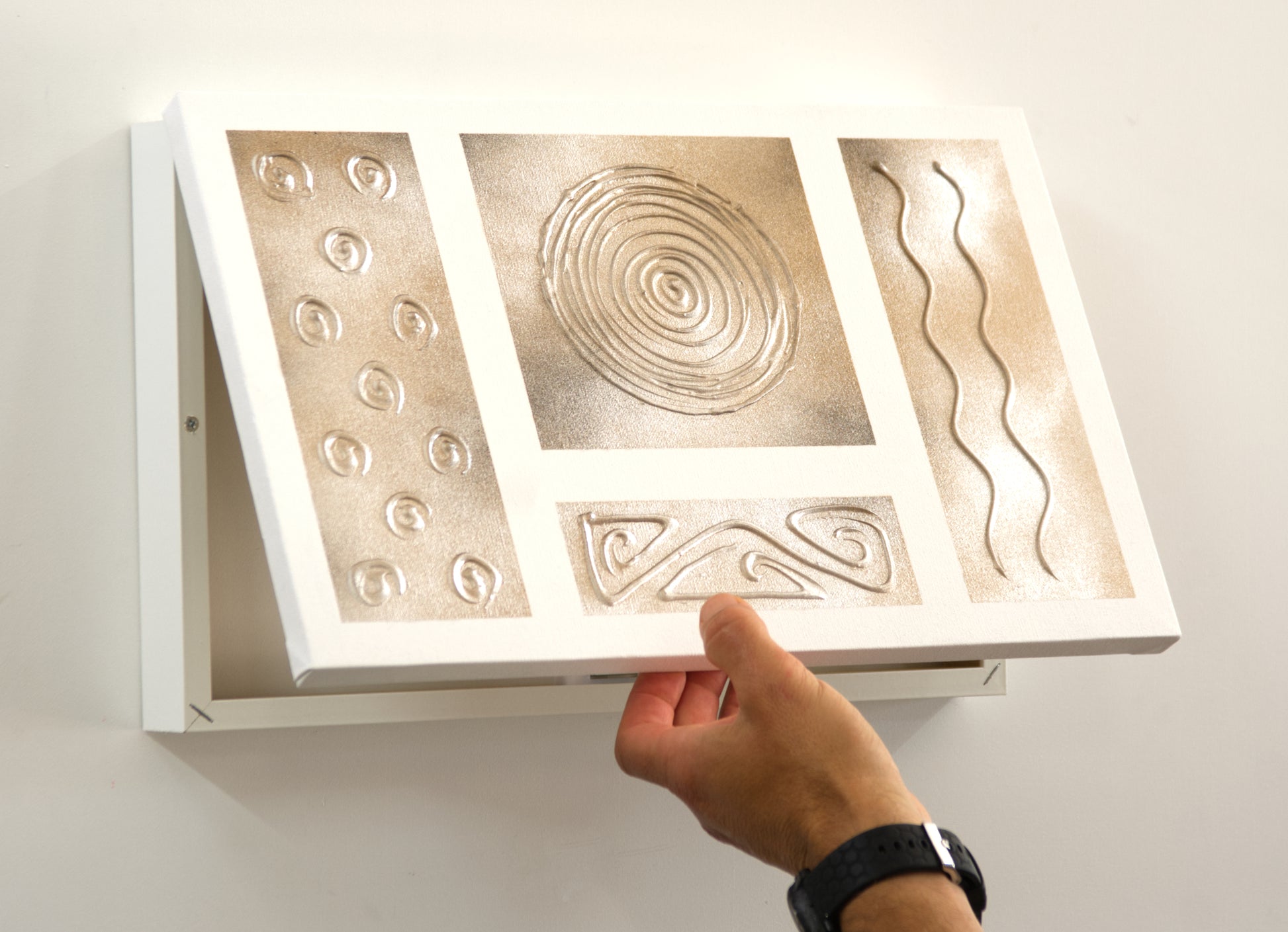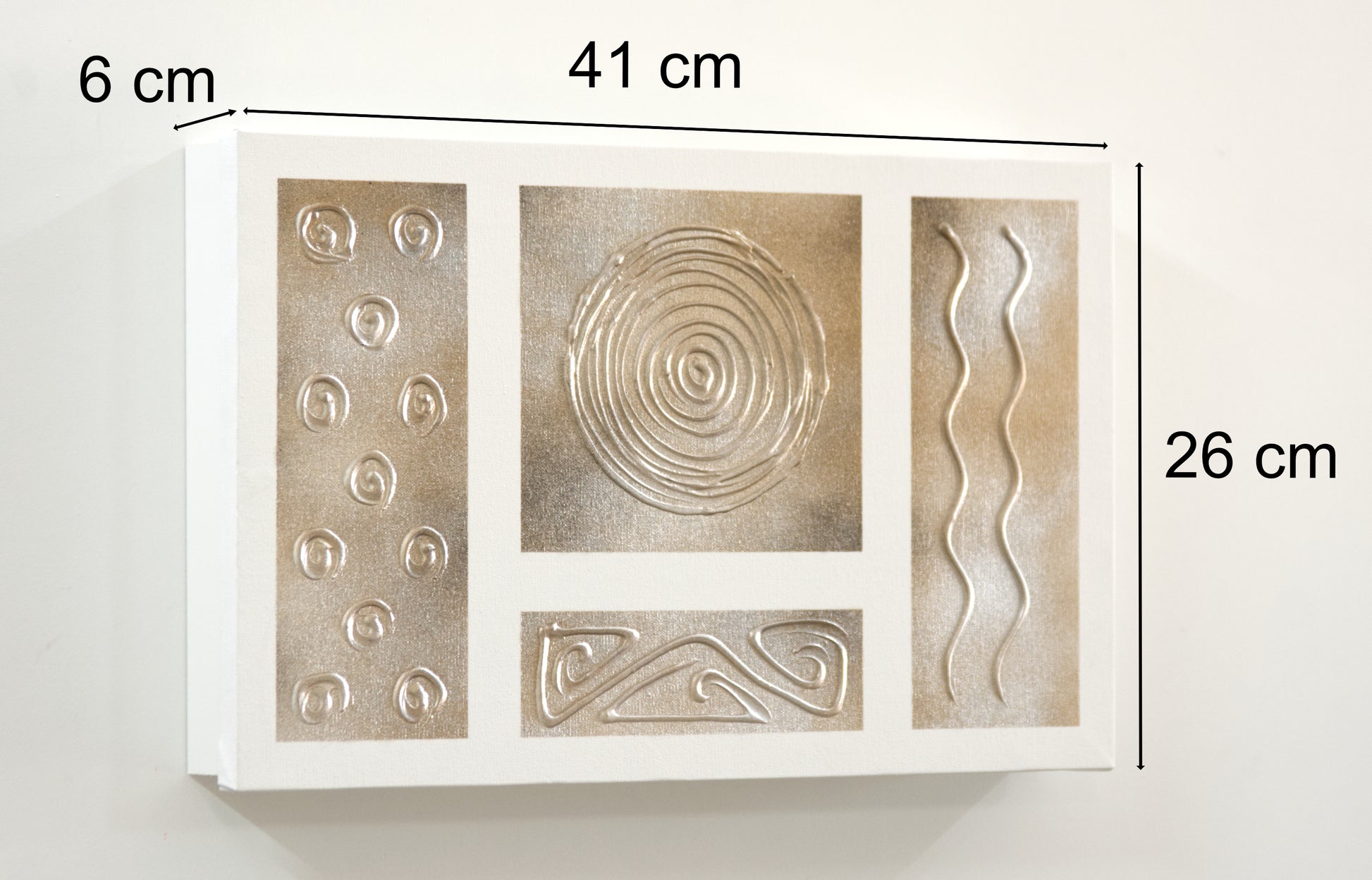 Tapa de Contador Pintada a Mano, 100% Original, Abstracta en dorado y plata, Incluye Tornillos y Tacos. Medidas: Interior 37x22x4cm Exterior 41x26x6cm
